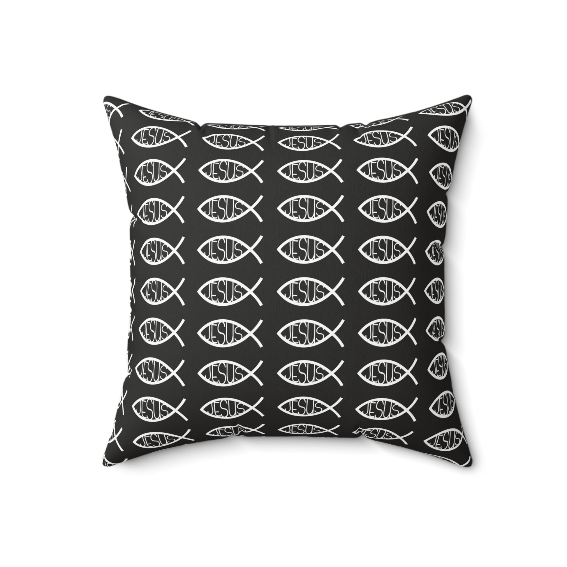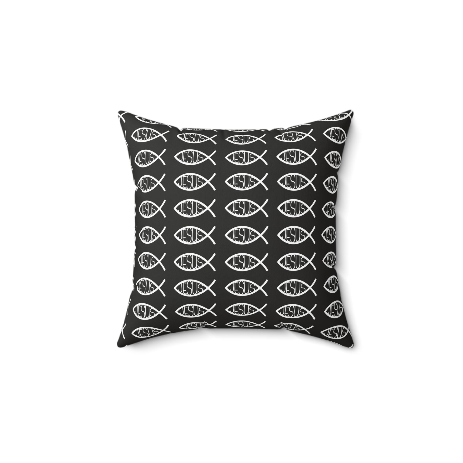 This Black and White decorative throw pillow features a Jesus Fish design, perfect for matching with your existing home decor. The pillow is made from 100% spun polyester, ensuring it retains its shape and doesn't wrinkle. The beige zipper with a metal head adds a stylish touch, and the double-sided print allows for versatility in styling. Ideal for Christians looking to add a religious touch to their living space, this pillow is perfect for Easter, Christmas, or everyday use.