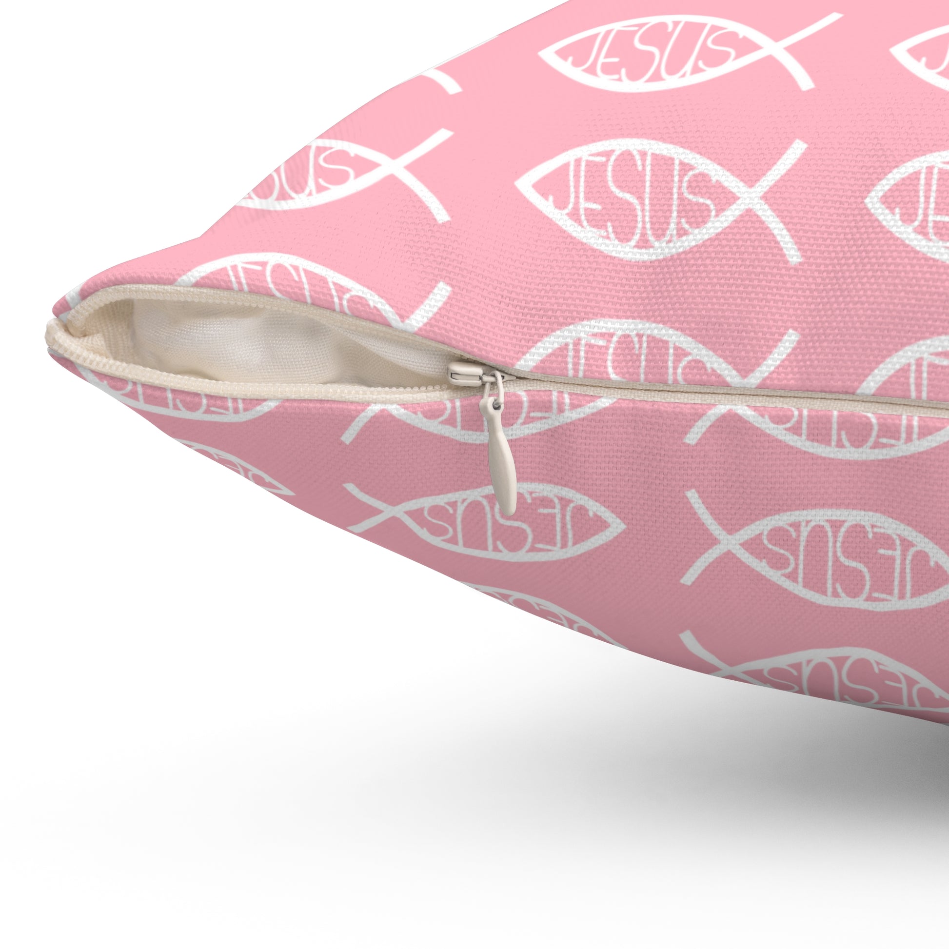 Our lovely decorative throw pillow featuring a Pink Jesus Fish design, is perfect for elevating and uplifting your existing home decor. This pillow is made from 100% spun polyester, ensuring it retains its shape and doesn't wrinkle. The beige zipper with a metal head adds a stylish touch, and the double-sided print allows for versatility in styling. Ideal for Christians looking to add a religious touch to their living space, this pillow is perfect for Easter, Christmas, or everyday use.