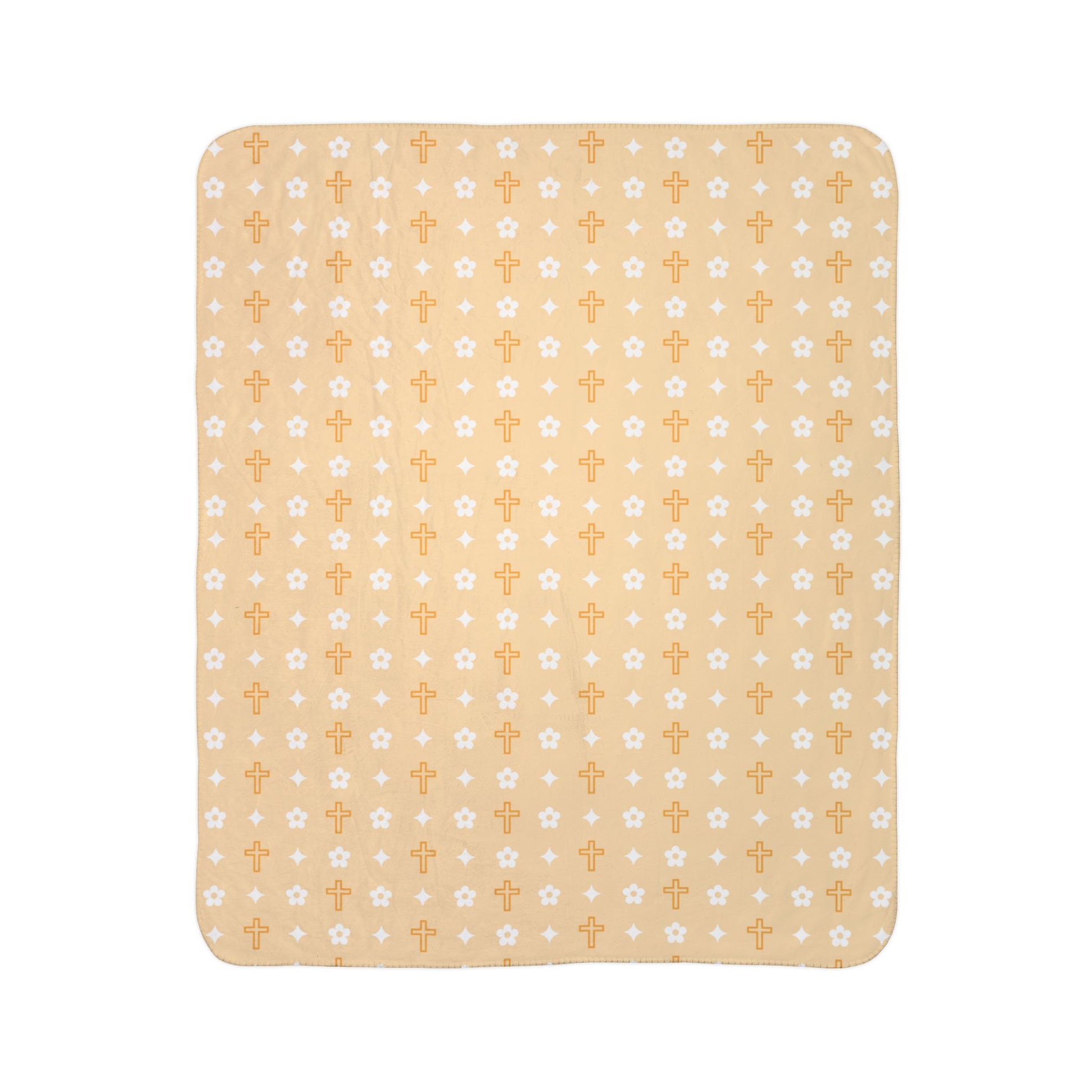 Our Creamsicle Daisy Cross Print - Cozy Sherpa Blanket is the perfect addition to brighten up your living or bedroom space! It is super soft to the touch and features a beautiful orange cream shade in a cute cross print design. Perfect for snuggling up on the couch during chilly evenings or adding a pop of color to your bedroom decor. It is great for those who enjoy creating a tranquil and inspiring atmosphere. Great for holidays, home decor, cozy nights in, and housewarming gifts.
